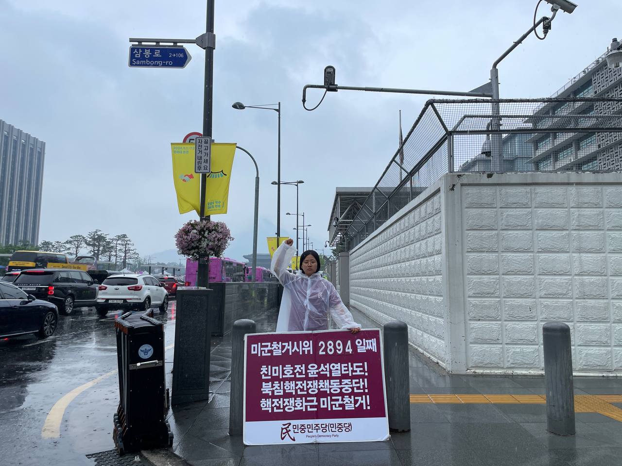 22일 민중민주당(민중당)은 미대사관앞에서 <친미호전윤석열타도! 북침핵전쟁책동중단! 핵전쟁화근 미군철거!> 구호를 들고 평화시위를 2894일째 전개했다.