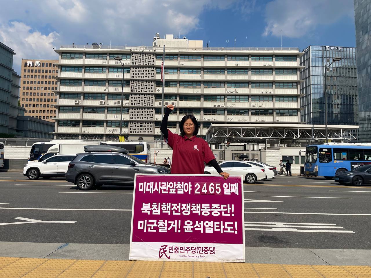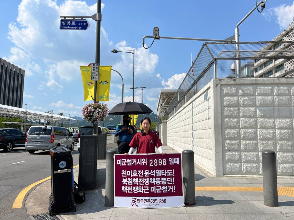 26일 민중민주당(민중당)은 미대사관앞에서 <친미호전윤석열타도! 북침핵전쟁책동중단! 핵전쟁화근 미군철거!> 구호를 들고 평화시위를 2898일째 전개했다.
