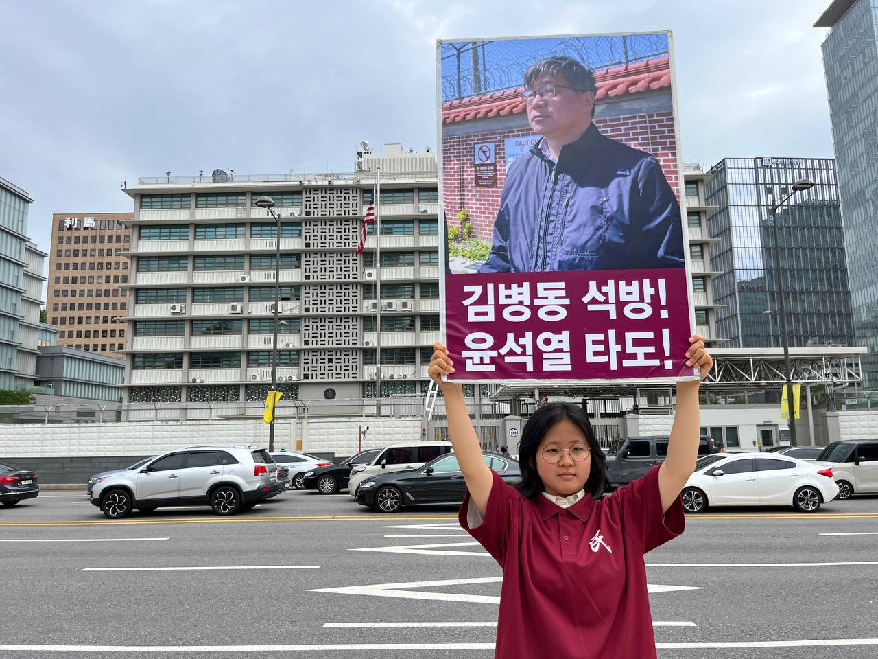 미대사관정문 맞은편에서는 우리말과 영어로 된 구호 <북침핵전쟁책동중단! 미군철거! 윤석열타도!>를 들고 <광화문미대사관앞철야시위>를 진행했다. <김병동석방! 윤석열타도!> 구호도 함께 들었다.