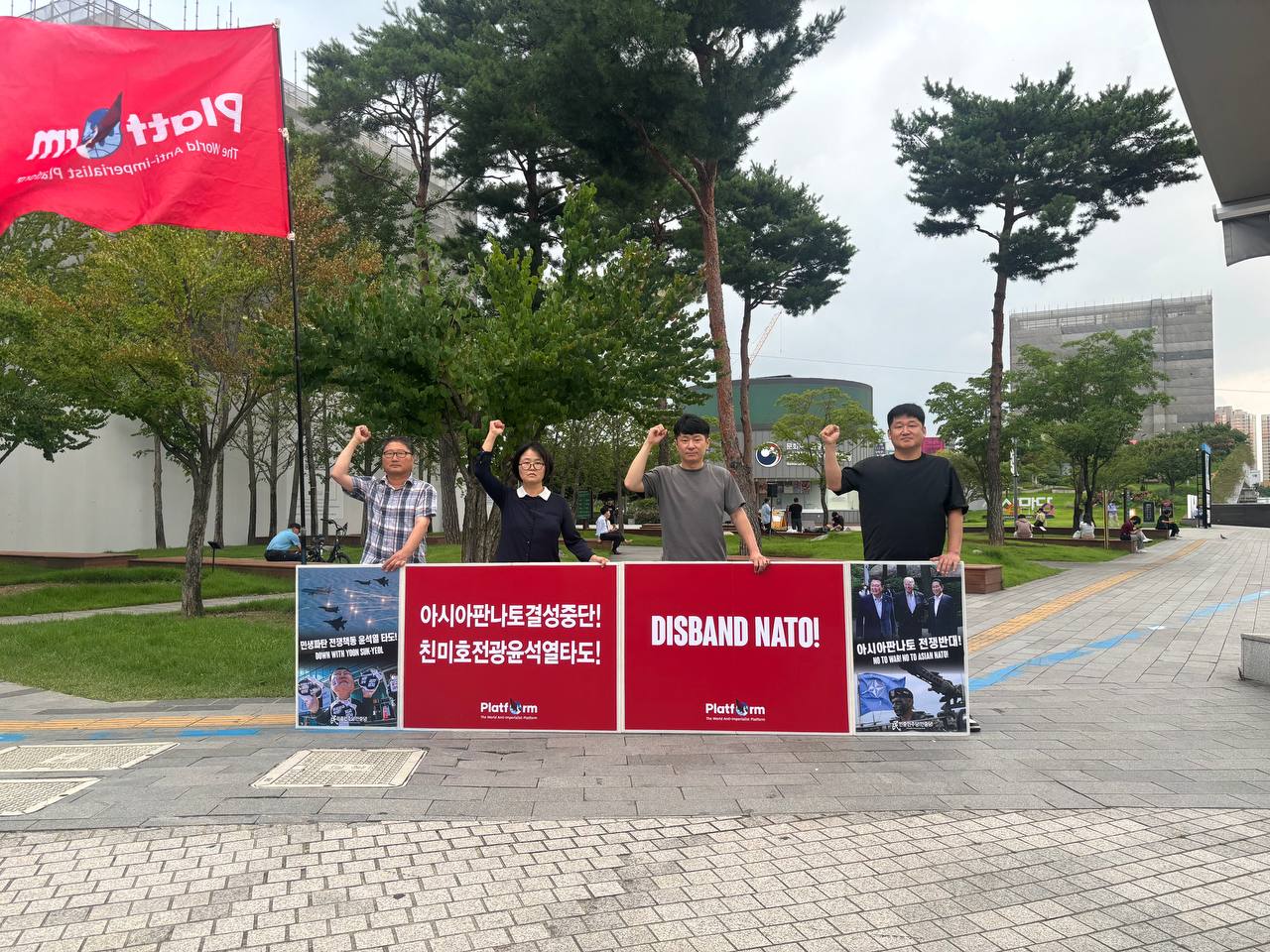 12일 광주 금남로 회화나무숲에서 민중민주당(민중당)광주시당과 지역활동가들은 우리말과 영어로 된 구호피씨 <아시아판나토결성중단! 친미호전광윤석열타도!>와 <DISBAND NATO!> 등을 내세웠다.
