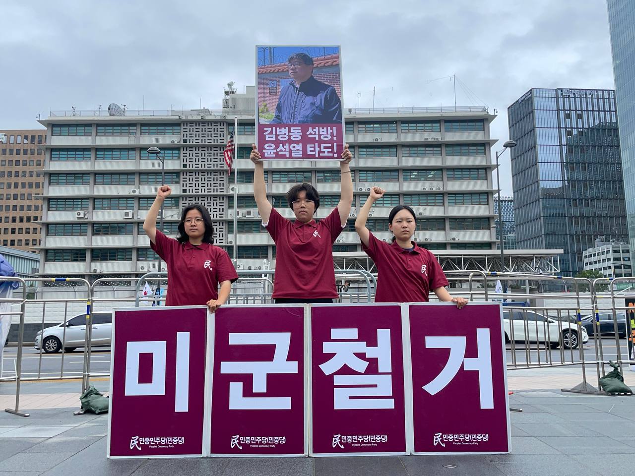 18일 민중민주당(민중당)은 미대사관앞에서 <친미호전윤석열타도! 북침핵전쟁책동중단! 핵전쟁화근 미군철거!> 구호를 들고 평화시위를 2920일째 전개했다.