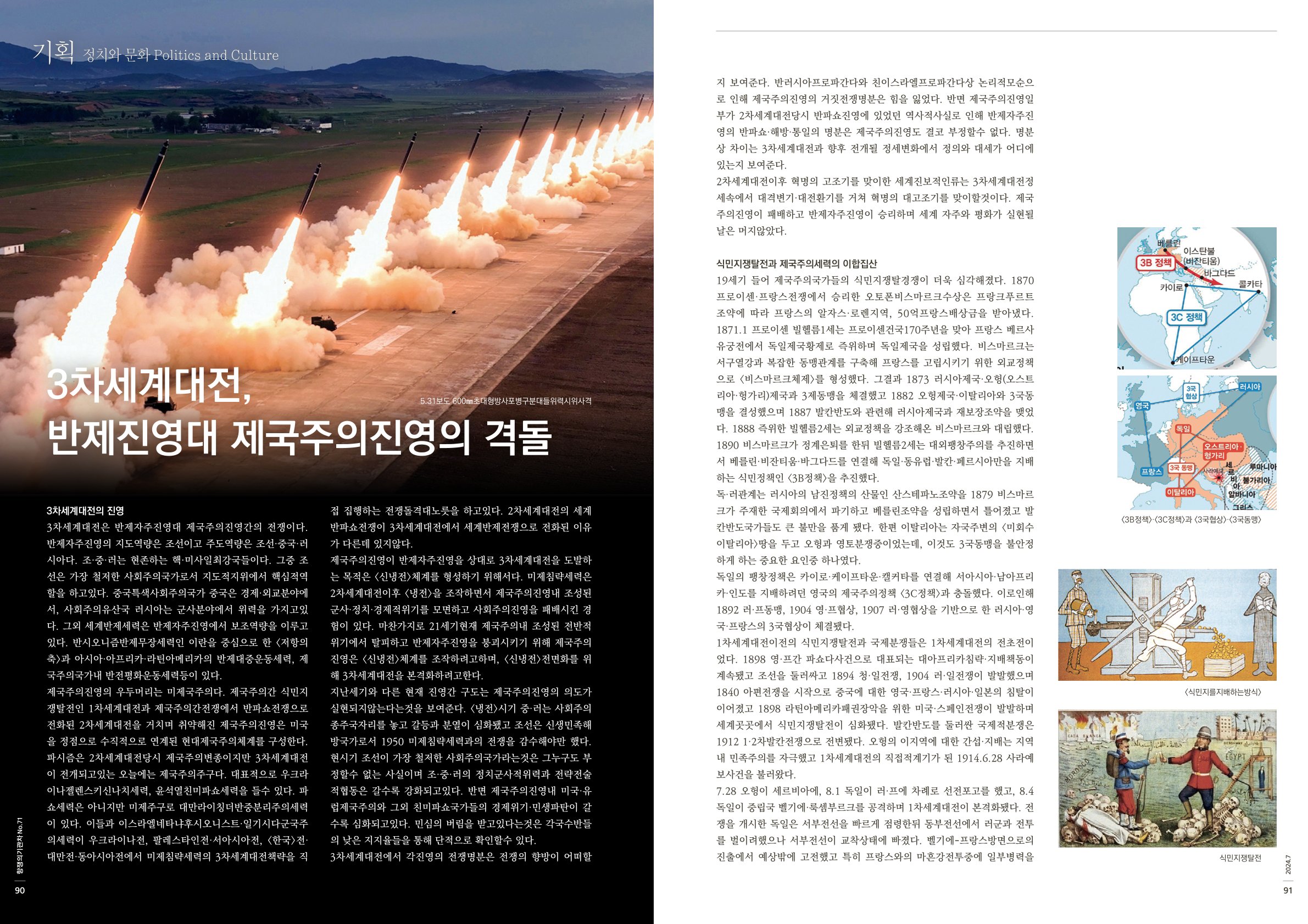 제국주의진영이 저지른 3차세계대전의 불길이 동유럽과 서아시아를 거쳐 동아시아로 번지고있다. 조·중을 겨냥한 <한국>전·대만전을 통해 동아시아전을 일으키며 3차세계대전을 본격화하려는 제국주의진영의 의도를 간파한 조·중이 전략적으로 동아시아개전을 지체하자 제국주의진영은 이미 전쟁중인 우크라이나전의 동유럽확전과 서아시아전확대를 통해 3차세계대전을 본격화하며 <신냉전>조작의 목적을 달성하려고 광분하고있다. 2024.5.31 미국이 우크라이나에 제공한 미국산무기를 이용한 러본토공격을 허용하자 나토12개국도 자국지원무기로 러영토공격을 허락했다. 우크라이나군은 다음날 미국산 하이마스로케트로 러본토를 타격하면서 대러침략도발을 심화했다. 나토국가들의 대러침략책동은 다방면적으로 드러났다. 2024.5 실시된 쿼드리가합동군사연습에서 독일군이 리투아니아에 최정예기갑부대를 투입하는 시나리오가 공개됐다. 네덜란드는 우크라이나에 지원한 F16편대에서 AIM120공대공미사일을 러영공에 발사하는 작전시나리오를 드러냈으며 미·영·프가 지원한 장거리미사일들, 예컨대 최대사거리240㎞공대지순항미사일 <스톰셰도우>·<칼리프>등으로 러군사기지·비행장·보급선을 공격하는안도 공개됐다. 한편 스웨덴·핀란드공군력을 동원한 대러시아책동도 드러났다. 일련의 반러침략책동에 대해 러시아측은 5.28 <나토가러시아연방에대한전투를수행하기위한시나리오를준비>·<여기에는우리영토에대한핵공격이포함된다>고 지적했다. 이같은 발언은 푸틴이 군에 전술핵무기훈련을 지시하며 핵태세를 증가하는 가운데 나왔다. 같은날 푸틴은 우즈베키스탄 타슈켄트에 방문해 나토국가들을 겨냥해 <지속적인긴장고조는심각한결과를초래할수있다>·<특히작은국가들은그들이무엇을가지고노는지알아야한다>·<작고인구밀도가높은나라들은러영토깊숙한곳을공격하기전에이를명심해야한다>고 경고했다.