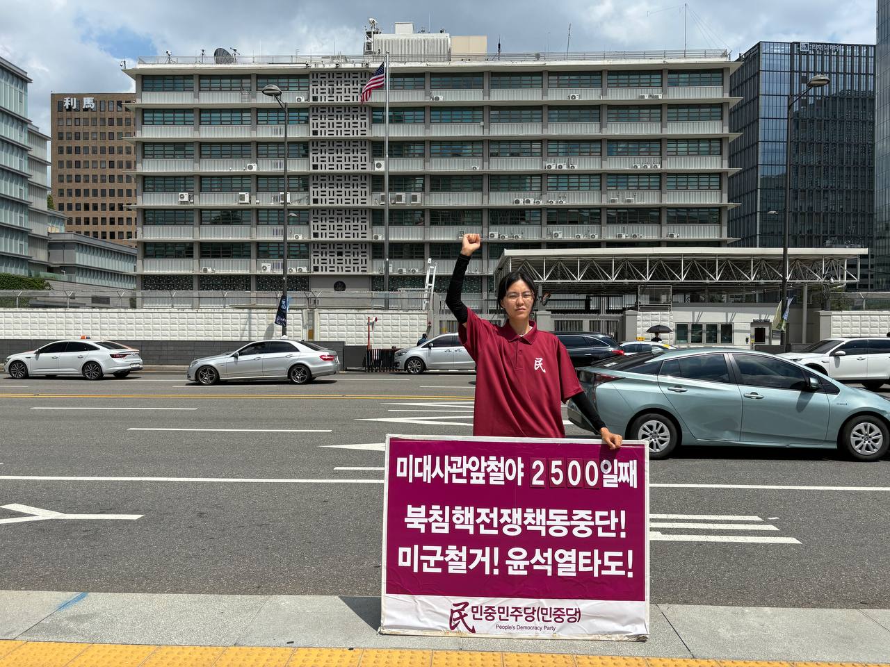 31일 민중민주당(민중당)은 미대사관앞에서 <친미호전윤석열타도! 북침핵전쟁책동중단! 핵전쟁화근 미군철거!> 구호를 들고 평화시위를 2933일째 전개했다.