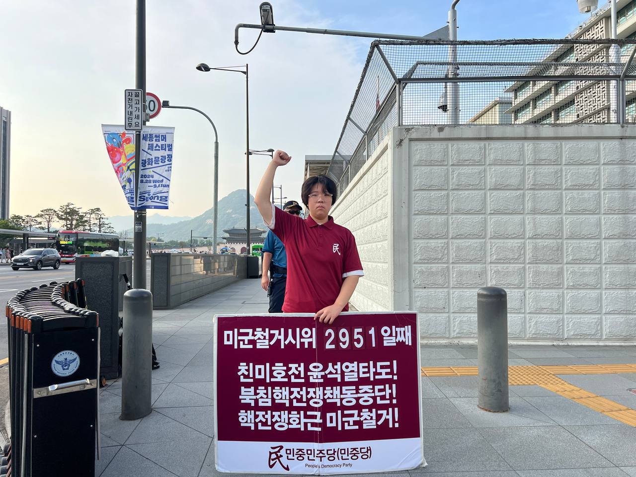 18일 민중민주당(민중당)은 미대사관앞에서 <친미호전윤석열타도! 북침핵전쟁책동중단! 핵전쟁화근 미군철거!> 구호를 들고 평화시위를 2951일째 전개했다.