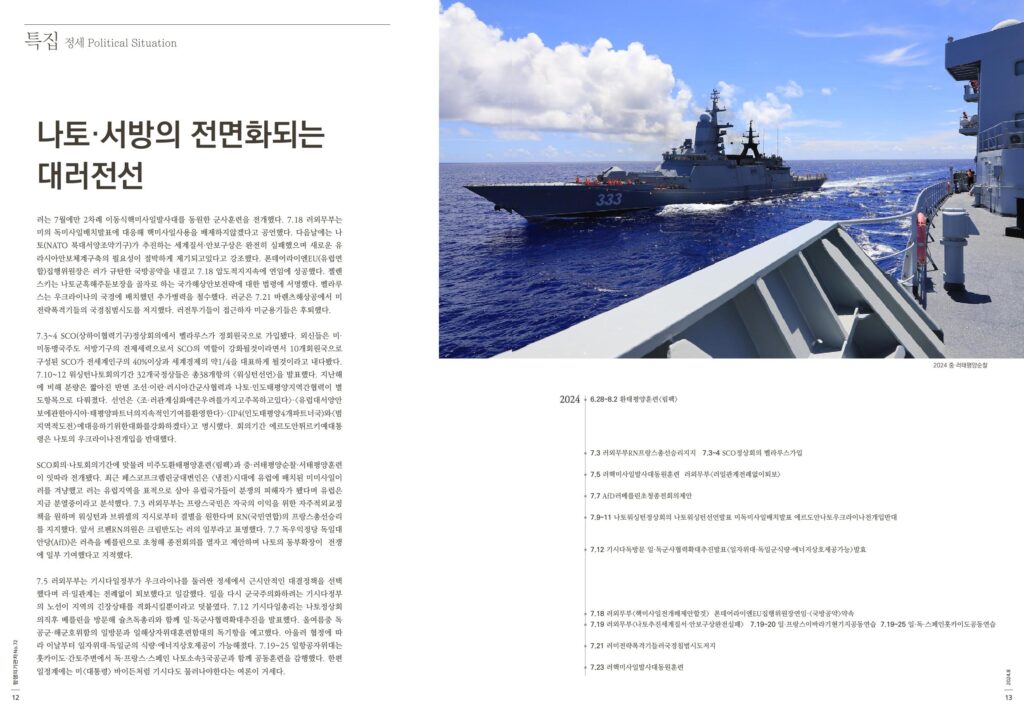 7.3~4 SCO(상하이협력기구)정상회의에서 벨라루스가 정회원국으로 가입됐다. 외신들은 미·미동맹국주도 서방기구의 견제세력으로서 SCO의 역할이 강화될것이라면서 10개회원국으로 구성된 SCO가 전세계인구의 40%이상과 세계경제의 약1/4을 대표하게 될것이라고 내다봤다. 7.10~12 워싱턴나토회의기간 32개국정상들은 총38개항의 <워싱턴선언>을 발표했다. 지난해에 비해 분량은 짧아진 반면 조선·이란·러시아간군사협력과 나토·인도태평양지역간협력이 별도항목으로 다뤄졌다. 선언은 <조·러관계심화에큰우려를가지고주목하고있다>·<유럽대서양안보에관한아시아·태평양파트너의지속적인기여를환영한다>·<IP4(인도태평양4개파트너국)와<범지역적도전>에대응하기위한대화를강화하겠다>고 명시했다. 회의기간 에르도안튀르키예대통령은 나토의 우크라이나전개입을 반대했다.