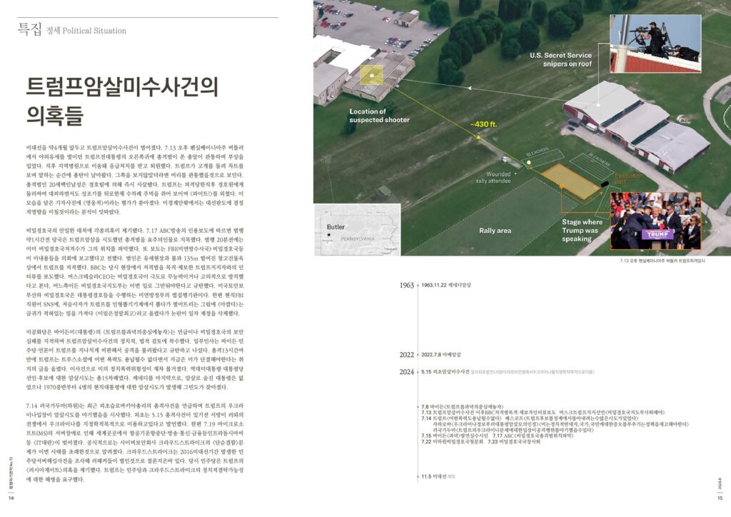미대선을 약4개월 앞두고 트럼프암살미수사건이 벌어졌다. 7.13 오후 펜실베이니아주 버틀러에서 야외유세를 벌이던 트럼프전대통령의 오른쪽귀에 총격범이 쏜 총알이 관통하며 부상을 입었다. 직후 지역병원으로 이송돼 응급처치를 받고 퇴원했다. 트럼프가 고개를 돌려 차트를 보며 말하는 순간에 총탄이 날아왔다. 그쪽을 보지않았더라면 머리를 관통했을것으로 보인다. 총격범인 20세백인남성은 경호팀에 의해 즉시 사살됐다. 트럼프는 피격당한직후 경호원에게 둘러싸여 대피하면서도 성조기를 뒤로한채 수차례 주먹을 쥐어 보이며 <파이트!>를 외쳤다. 이모습을 담은 기자사진에 <영웅적>이라는 평가가 쏟아졌다. 미정계안팎에서는 대선판도에 결정적영향을 미칠것이라는 분석이 잇따랐다.