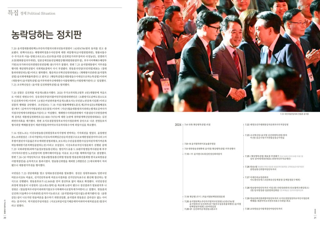 국민당은 7.23 전당대회를 열고 당대표경선결과를 발표했다. 경선은 당원투표80% 일반국민여론조사20% 비율로, 선거인단투표에 여론조사결과를 선거인단득표수로 환산해 합산하는 방식으로 진행됐다. 한동훈후보가 62.84%를 얻어 결선투표 없이 대표로 확정됐다. 국민당경선과정에 한동훈이 나경원의 <공소취소청탁>을 폭로해 논란이 됐으나 경선결과가 발표된직후 나경원은 <힘을합쳐우리당이내외위기를모두극복해하나로힘차게가야한다>고 말했다. 한동훈의 김건희<디올백수수사과관련>문자무시논란으로 <윤석열과돌이킬수없는관계가됐다>등 <윤한갈등>설이 나오지만 반윤여론을 흡수하기 위한것일뿐, 윤석열과 한동훈은 갈라설수 없는 사이라는 분석이다. 박지원민주당의원은 <서로X파일이있기때문에악어와악어새처럼공존>할것이라고 말했다.