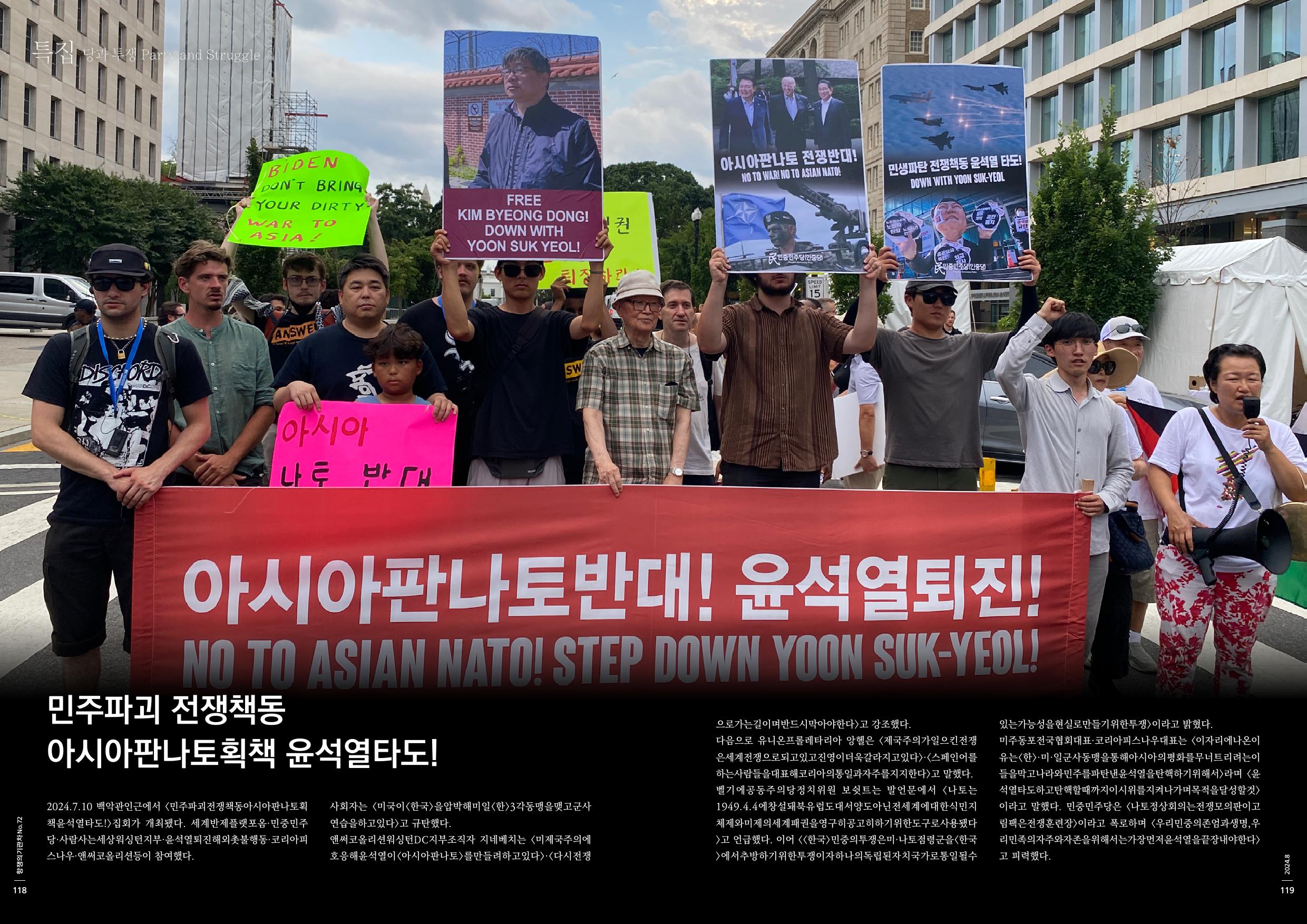 앤써코올리션워싱턴DC지부조직자 지네베치는 <미제국주의에호응해윤석열이<아시아판나토>를만들려하고있다>·<다시전쟁으로가는길이며반드시막아야한다>고 강조했다.
