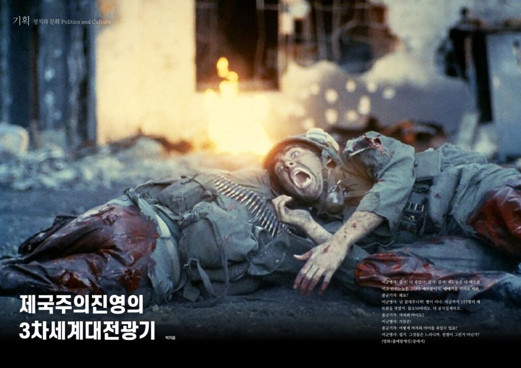 미군병사: 갈겨! 너 죽었다! 갈겨! 갈겨! 뛰는놈은 다 베트콩이고 안뛰는놈은 고단수 베트콩이지. 내얘기를 기사로 써봐.