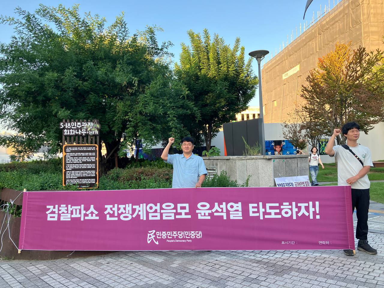 정당연설회 민중민주당광주시당, 청년단체〈새날〉회원들과 선전전 진행 2024년 9월 5일 FacebookTwitter 4일 민중민주당(민중당)광주시당은 청년단체<새날>회원들과 함께 윤석열정부의 민중민주당파쇼탄압을 규탄하고 국가보안법 철폐를 촉구하는 선전전을 진행했다. 회원들은 5.18민주광장에서 <계엄음모 전쟁도발 국가보안법 철폐! 친일역적 용산총독 윤석열 심판!> 구호판을 들고 시위를 전개, <검찰파쇼 전쟁계엄음모 윤석열 타도하자!> 가로막을 들고 선동연설을 진행했다. 지역에서의 실천은 계속된다.