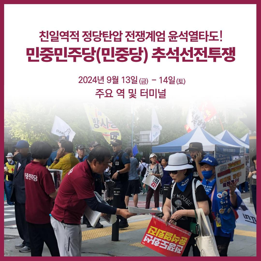 소식 [소식] 민중민주당 추석선전투쟁 2024년 9월 12일 FacebookTwitter 친일역적 정당탄압 전쟁계엄 윤석열 타도하자! 9월13~14일 추석연휴를 맞아 전국 주요 역 및 터미널에서 민중민주당(민중당)의 추석선전투쟁이 진행됩니다.
