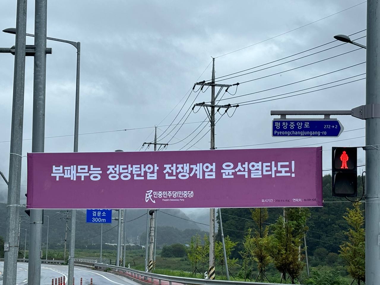 12일 민중민주당(민중당)은 강원도 평창 군청사거리·평창사거리·장평IC입구에 가로막 <검찰파쇼 정당탄압 전쟁계엄 윤석열타도!>, <부패무능 정당탄압 전쟁계엄 윤석열타도!>, <친일역적 정당탄압 전쟁계엄 윤석열타도!>를 게시했다.