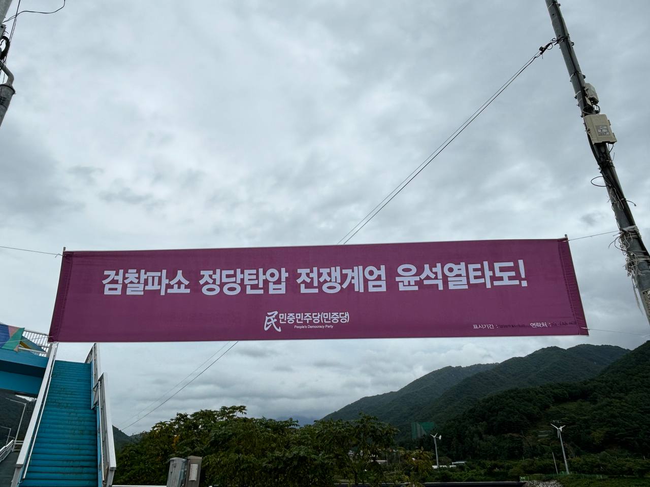 실천정당연설회 민중민주당강원도당 13일 인제 가로막게시 … 〈정당탄압 윤석열타도!〉 2024년 9월 14일 FacebookTwitter 13일 민중민주당(민중당)은 강원도 인제 신남버스터미널앞·원통교차로에 가로막 <검찰파쇼 정당탄압 전쟁계엄 윤석열타도!>, <친일역적 정당탄압 전쟁계엄 윤석열타도!>를 게시했다. 파쇼탄압에 반대하는 민중민주당의 투쟁은 계속된다.