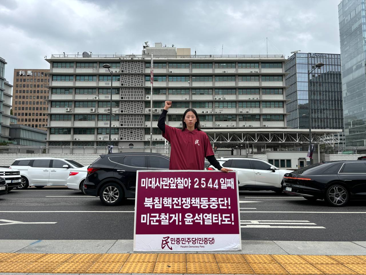 13일 민중민주당(민중당)은 미대사관앞에서 <친미호전윤석열타도! 북침핵전쟁책동중단! 핵전쟁화근 미군철거!> 구호를 들고 평화시위를 2977일째 전개했다.
