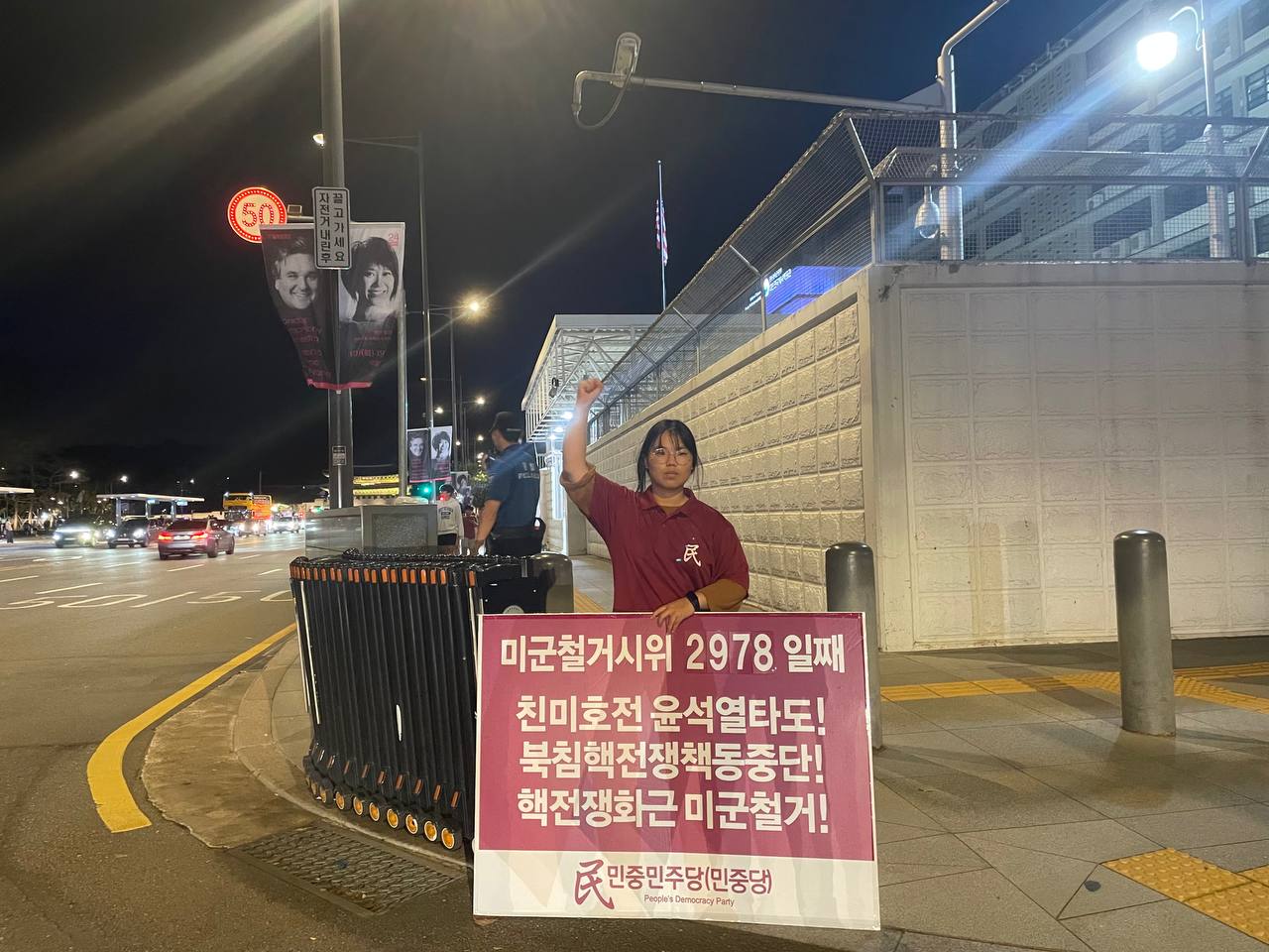 14일 민중민주당(민중당)은 미대사관앞에서 <친미호전윤석열타도! 북침핵전쟁책동중단! 핵전쟁화근 미군철거!> 구호를 들고 평화시위를 2978일째 전개했다.
