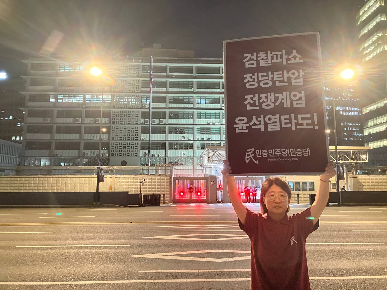 미대사관정문 맞은편에서는 우리말과 영어로 된 구호 <북침핵전쟁책동중단! 미군철거! 윤석열타도!>를 들고 <광화문미대사관앞철야시위>를 진행했다. <김병동석방! 윤석열타도!>, <검찰파쇼 정당탄압 전쟁계엄 윤석열타도!> 구호도 함께 들었다.