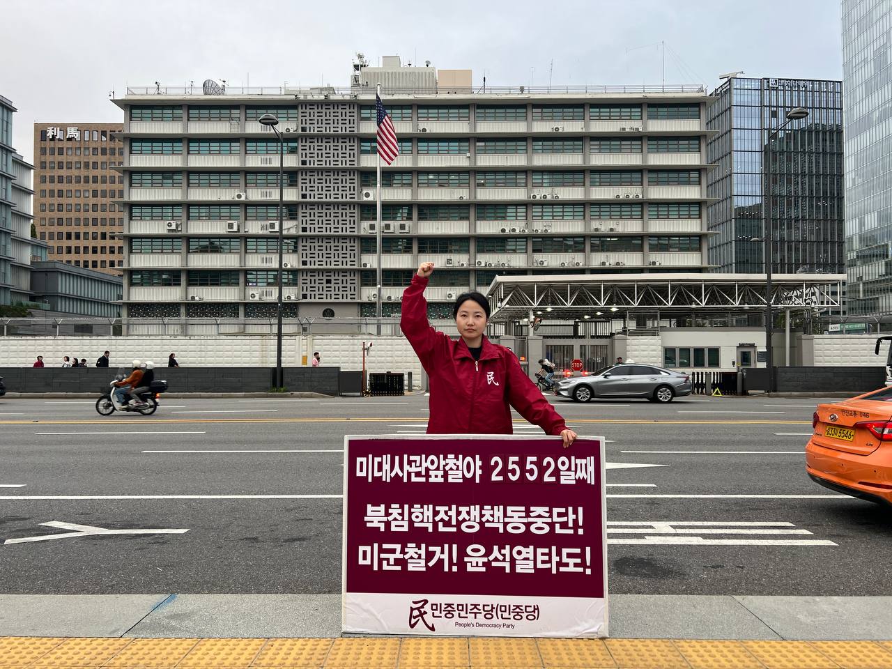 21일 민중민주당(민중당)은 미대사관앞에서 <친미호전윤석열타도! 북침핵전쟁책동중단! 핵전쟁화근 미군철거!> 구호를 들고 평화시위를 2985일째 전개했다.