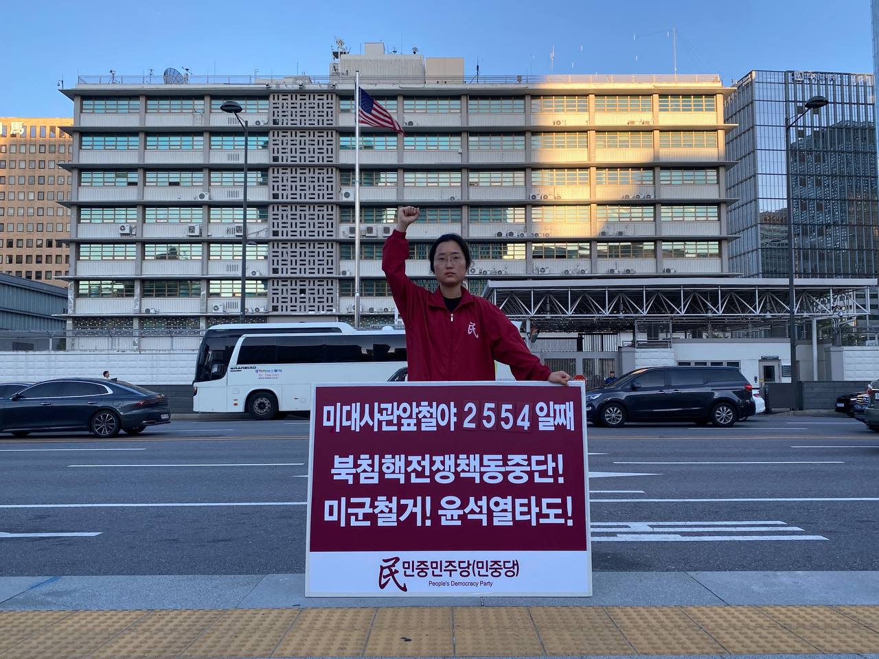23일 민중민주당(민중당)은 미대사관앞에서 <친미호전윤석열타도! 북침핵전쟁책동중단! 핵전쟁화근 미군철거!> 구호를 들고 평화시위를 2987일째 전개했다.