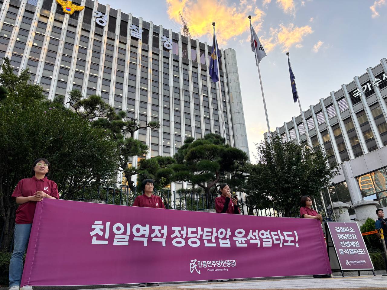 23일 민중민주당(민중당)은 남대문경찰서, 성북경찰서에 이어 경찰청앞에서 <친일역적 정당탄압 윤석열타도!> 구호를 들고 정당연설회를 진행했다.