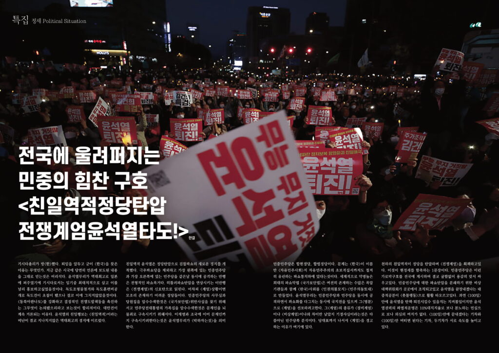 천하의 친일역적이 정당을 탄압하며 <전쟁계엄>을 획책하고있다. 이것이 현정세를 함축하는 1문장이다. 민중민주당은 이런 가로막구호를 전국에 게시하며 결코 굴함없이 용감히 맞서 싸우고있다. 민중민주당에 대한 파쇼탄압을 분쇄하기 위한 비상대책위원회가 곳곳에서 조직되고있고 윤석열을 끝장내겠다는 대중적공분이 <촛불행동>으로 활활 타오르고있다. 과연 <100일>안에 윤석열을 탄핵·퇴진시킬수 있을지는 지켜볼일이지만 윤석열권력의 파멸적운명은 10%대지지율로 보나 분노하는 민심으로 보나 의심의 여지가 없다. <100일>안에 끝내겠다는 기차와 <100일>만 버티면 된다는 기차, 두기차가 서로 속도를 높이고있다.