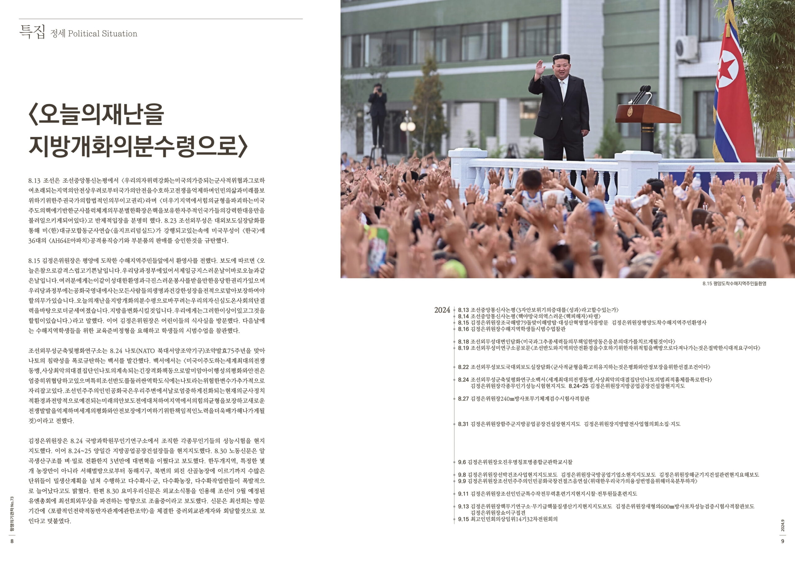 김정은위원장은 8.24 국방과학원무인기연구소에서 조직한 각종무인기들의 성능시험을 현지지도했다. 이어 8.24~25 양일간 지방공업공장건설장들을 현지지도했다. 8.30 노동신문은 알곡생산구조를 벼·밀로 전환한지 3년만에 대변혁을 이뤘다고 보도했다. 한두개지역, 특정한 몇개 농장만이 아니라 서해벌방으로부터 동해지구, 북변의 외진 산골농장에 이르기까지 수많은 단위들이 밀생산계획을 넘쳐 수행하고 다수확시·군, 다수확농장, 다수확작업반들이 폭발적으로 늘어났다고도 밝혔다. 한편 8.30 요미우리신문은 외교소식통을 인용해 조선이 9월 예정된 유엔총회에 최선희외무상을 파견하는 방향으로 조율중이라고 보도했다. 신문은 최선희는 방문기간에 <포괄적인전략적동반자관계에관한조약>을 체결한 중러외교관계자와 회담할것으로 보인다고 덧붙였다.