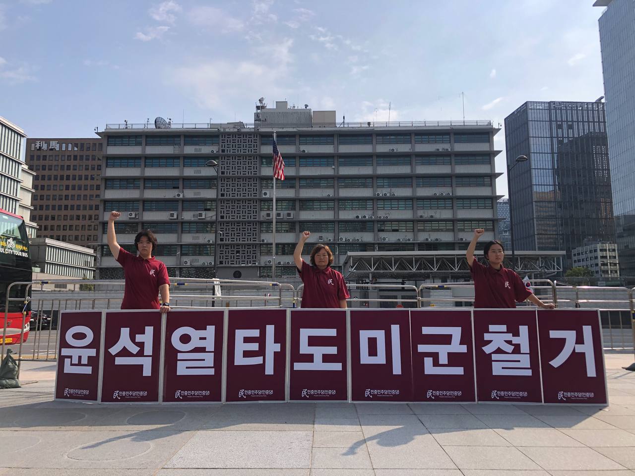 26일 민중민주당(민중당)은 미대사관앞에서 <친미호전윤석열타도! 북침핵전쟁책동중단! 핵전쟁화근 미군철거!> 구호를 들고 평화시위를 2990일째 전개했다.