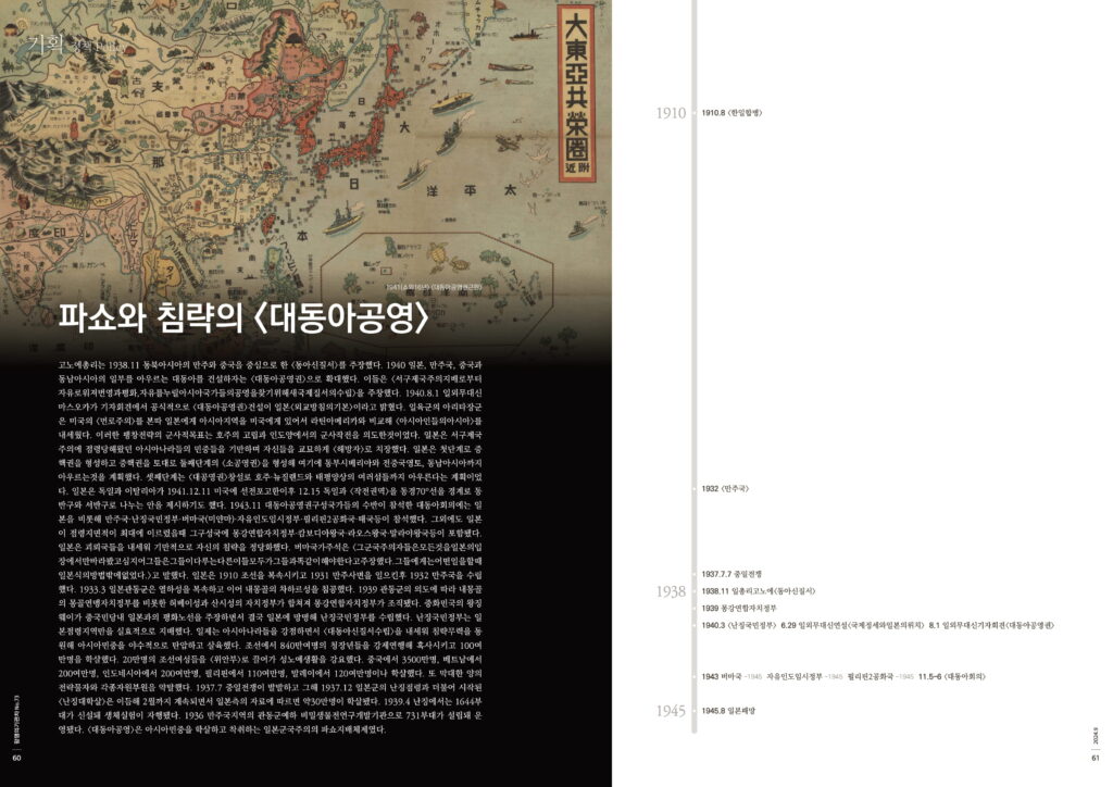 고노에총리는 1938.11 동북아시아의 만주와 중국을 중심으로 한 <동아신질서>를 주장했다. 1940 일본, 만주국, 중국과 동남아시아의 일부를 아우르는 대동아를 건설하자는 <대동아공영권>으로 확대했다. 이들은 <서구제국주의지배로부터자유로워져번영과평화,자유를누릴아시아국가들의공영을찾기위해새국제질서의수립>을 주창했다. 1940.8.1 일외무대신 마스오카가 기자회견에서 공식적으로 <대동아공영권>건설이 일본<외교방침의기본>이라고 밝혔다. 일육군의 아리타장군은 미국의 <먼로주의>를 본따 일본에게 아시아지역을 미국에게 있어서 라틴아메리카와 비교해 <아시아인들의아시아>를 내세웠다. 이러한 팽창전략의 군사적목표는 호주의 고립과 인도양에서의 군사작전을 의도한것이었다. 일본은 서구제국주의에 점령당해왔던 아시아나라들의 민중들을 기만하며 자신들을 교묘하게 <해방자>로 치장했다. 일본은 첫단계로 중핵권을 형성하고 중핵권을 토대로 둘째단계의 <소공영권>을 형성해 여기에 동부시베리아와 전중국영토, 동남아시아까지 아우르는것을 계획했다. 셋째단계는 <대공영권>창설로 호주·뉴질랜드와 태평양상의 여러섬들까지 아우른다는 계획이었다. 일본은 독일과 이탈리아가 1941.12.11 미국에 선전포고한이후 12.15 독일과 <작전권역>을 동경70°선을 경계로 동반구와 서반구로 나누는 안을 제시하기도 했다. 1943.11 대동아공영권구성국가들의 수반이 참석한 대동아회의에는 일본을 비롯해 만주국·난징국민정부·버마국(미얀마)·자유인도임시정부·필리핀2공화국·태국등이 참석했다. 그외에도 일본이 점령지면적이 최대에 이르렀을때 그구성국에 몽강연합자치정부·캄보디아왕국·라오스왕국·말라야왕국등이 포함됐다. 일본은 괴뢰국들을 내세워 기만적으로 자신의 침략을 정당화했다. 버마국가주석은 <그군국주의자들은모든것을일본의입장에서만바라봤고심지어그들은그들이다루는다른이들모두가그들과똑같이해야한다고주장했다.그들에게는어떤일을할때일본식의방법밖에없었다.>고 말했다. 일본은 1910 조선을 복속시키고 1931 만주사변을 일으킨후 1932 만주국을 수립했다. 1933.3 일본관동군은 열하성을 복속하고 이어 내몽골의 차하르성을 침공했다. 1939 관동군의 의도에 따라 내몽골의 몽골연맹자치정부를 비롯한 허베이성과 산시성의 자치정부가 합쳐져 몽강연합자치정부가 조직됐다. 중화민국의 왕징웨이가 중국민당내 일본과의 평화노선을 주장하면서 결국 일본에 망명해 난징국민정부를 수립했다. 난징국민정부는 일본점령지역만을 실효적으로 지배했다. 일제는 아시아나라들을 강점하면서 <대동아신질서수립>을 내세워 침략무력을 동원해 아시아민중을 야수적으로 탄압하고 살육했다. 조선에서 840만여명의 청장년들을 강제연행해 혹사시키고 100여만명을 학살했다. 20만명의 조선여성들을 <위안부>로 끌어가 성노예생활을 강요했다. 중국에서 3500만명, 베트남에서 200여만명, 인도네시아에서 200여만명, 필리핀에서 110여만명, 말레이에서 120여만명이나 학살했다. 또 막대한 양의 전략물자와 각종자원부원을 약탈했다. 1937.7 중일전쟁이 발발하고 그해 1937.12 일본군의 난징점령과 더불어 시작된 <난징대학살>은 이듬해 2월까지 계속되면서 일본측의 자료에 따르면 약30만명이 학살됐다. 1939.4 난징에서는 1644부대가 신설돼 생체실험이 자행됐다. 1936 만주국지역의 관동군예하 비밀생물전연구개발기관으로 731부대가 설립돼 운영됐다. <대동아공영>은 아시아민중을 학살하고 착취하는 일본군국주의의 파쇼지배체제였다.