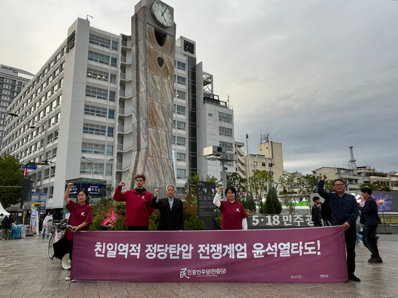 3일 민중민주당(민중당)광주시당은 5.18민주광장에서 <윤석열타도!>구호를 들고 정당연설회를 진행했다. 프랑스진보정치단체 PRCF 아나톨 사와식(Anatole Sawosik)니스지부장이 연대했다.