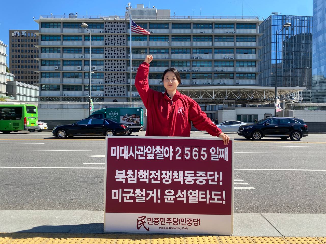 4일 민중민주당(민중당)은 미대사관앞에서 <친미호전윤석열타도! 북침핵전쟁책동중단! 핵전쟁화근 미군철거!> 구호를 들고 평화시위를 2998일째 전개했다.