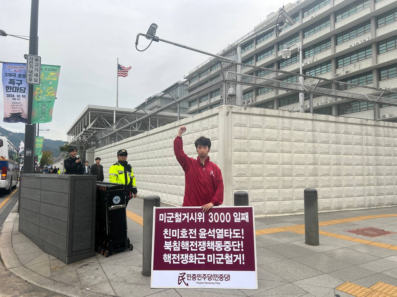6일 민중민주당(민중당)은 미대사관앞에서 <친미호전윤석열타도! 북침핵전쟁책동중단! 핵전쟁화근 미군철거!> 구호를 들고 평화시위를 3000일째 전개했다.