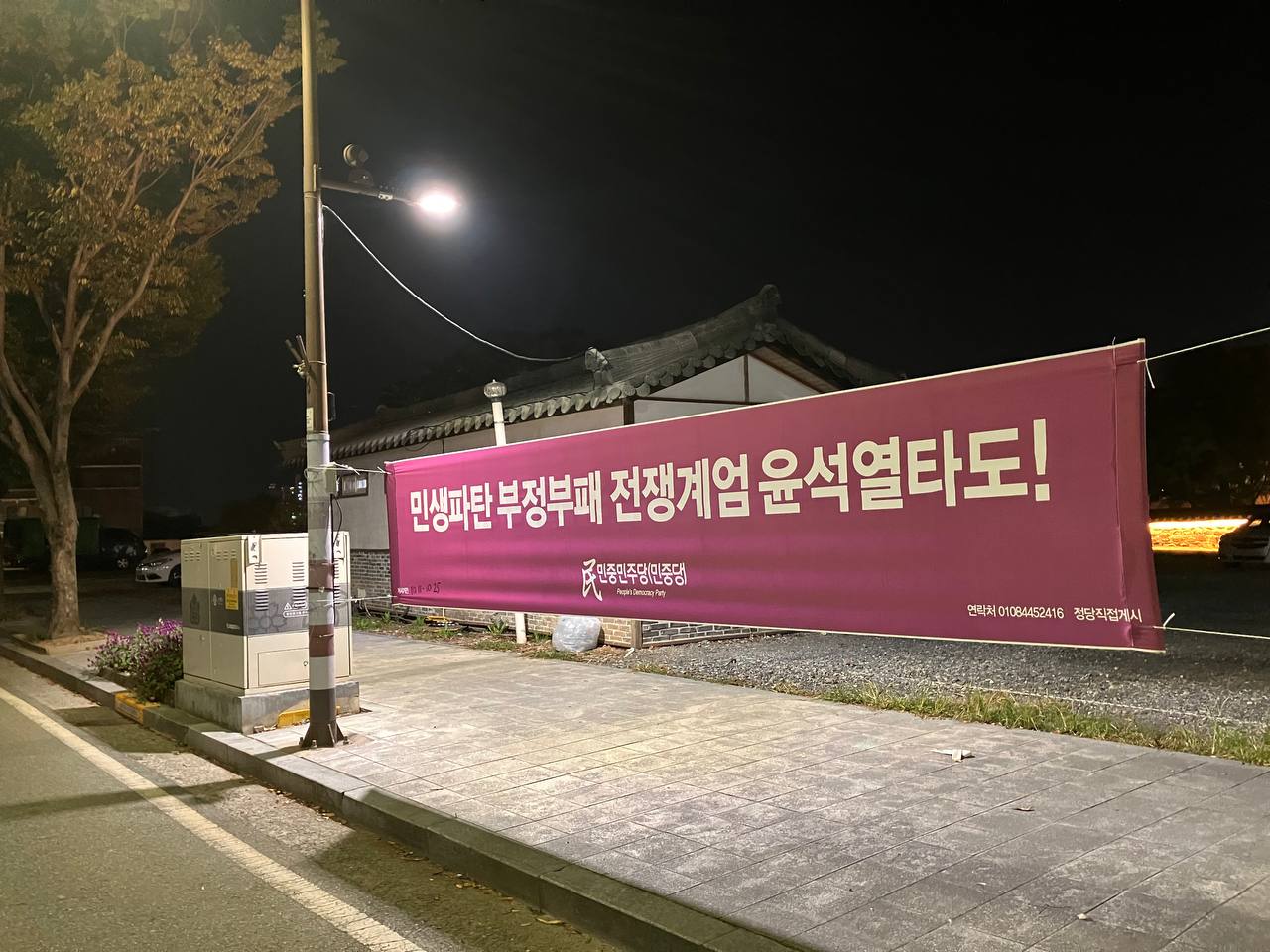 정당연설회 민중민주당광주시당 11일 나주 〈윤석열타도〉가로막게시 2024년 10월 12일 FacebookTwitter 11일 민중민주당(민중당)광주시당은 <민생파탄 부정부패 전쟁계엄 윤석열타도!> 구호의 가로막을 전남 나주 금성관길 전통한옥마을·나주역·나주영산강축제장진입로·대호동수변공원·동신대앞·영산강승촌보에 내걸었다.