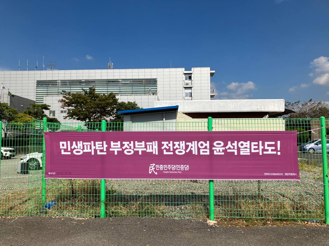 12일 민중민주당(민중당)광주시당은 전남 순천 NC백화점앞사거리·조례사거리·승주군선암사앞사거리·순천역에 <민생파탄 부정부패 전쟁계엄 윤석열타도!>가로막을 게시한 뒤 순천역앞에서 정당연설회를 진행했다.
