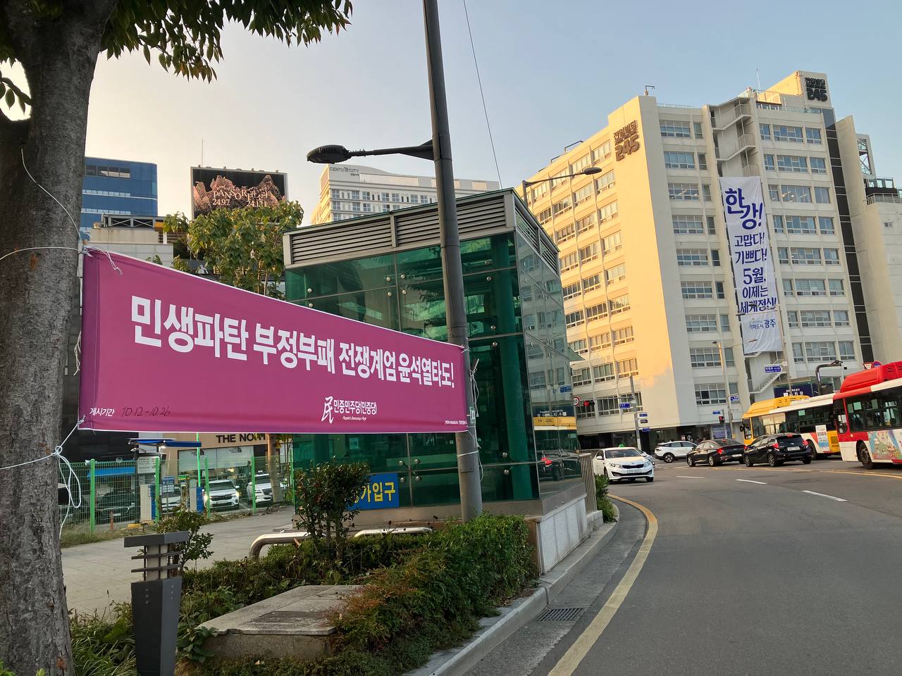 12일 민중민주당(민중당)광주시당은 광주 서구 상무자유로사거리·운천저수지앞사거리, 동구 5.18민주광장인근, 광산구 평동역앞·선운지구앞사거리에 가로막 <민생파탄 부정부패 전쟁계엄 윤석열타도!>를 내걸었다.