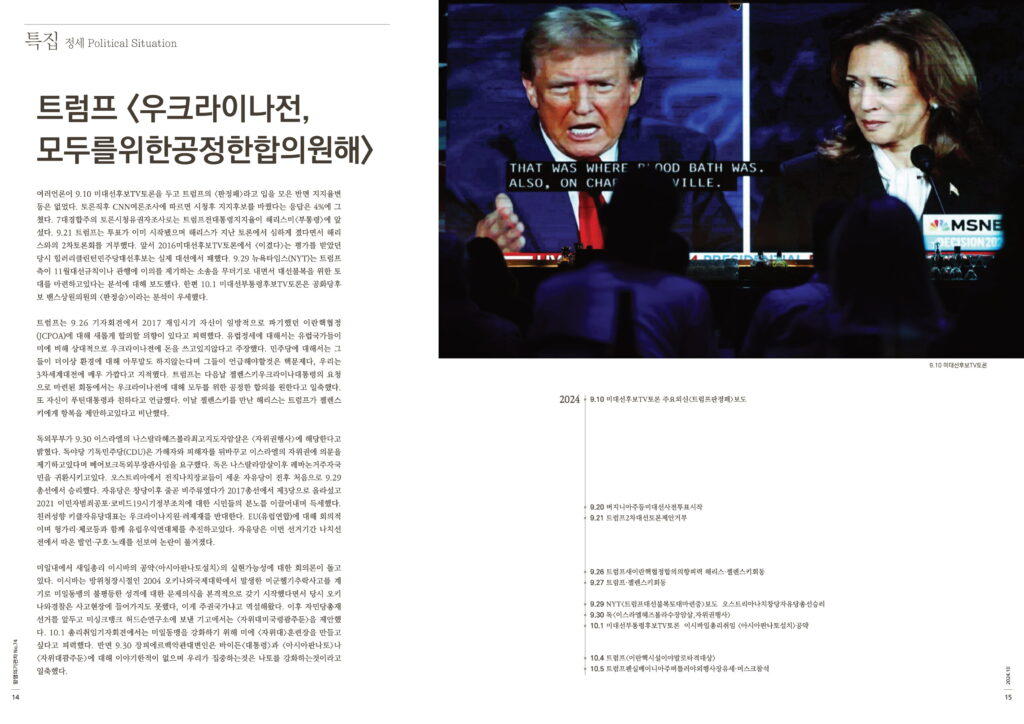 트럼프는 9.26 기자회견에서 2017 재임시기 자신이 일방적으로 파기했던 이란핵협정(JCPOA)에 대해 새롭게 합의할 의향이 있다고 피력했다. 유럽정세에 대해서는 유럽국가들이 미에 비해 상대적으로 우크라이나전에 돈을 쓰고있지않다고 주장했다. 민주당에 대해서는 그들이 더이상 환경에 대해 아무말도 하지않는다며 그들이 언급해야할것은 핵문제다, 우리는 3차세계대전에 매우 가깝다고 지적했다. 트럼프는 다음날 젤렌스키우크라이나대통령의 요청으로 마련된 회동에서는 우크라이나전에 대해 모두를 위한 공정한 합의를 원한다고 일축했다. 또 자신이 푸틴대통령과 친하다고 언급했다. 이날 젤렌스키를 만난 해리스는 트럼프가 젤렌스키에게 항복을 제안하고있다고 비난했다.