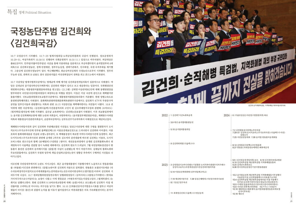 10.7 국정감사가 시작됐다. 10.7~29 법제사법위등14개상임위원회의 국감이 진행된다. 정보운영위가 10.29~31, 여성가족위가 10.30·31 진행되며 국회운영위가 10.31·11.1 일정으로 마무리된다. 피감대상은 총802곳이다. 민주당(더불어민주당)은 국감을 통해 각종의혹을 집중적으로 추궁하겠다면서 윤석열정부의 6대의혹으로 김건희국정농단, 경제·민생대란, 정부무능실정, 권력기관폭주, 인사폭망, 국권·국격추락을 제기했다. 그중심에 김건희국정농단이 있다. 박근혜탄핵도 최순실비선실세의 국정농단으로부터 시작됐다. 정부의 무능과 실정, 권력의 오·남용도 결국 검증되지않은 비선권력집단이 권력을 쥐고 흔드는데서 비롯된다.