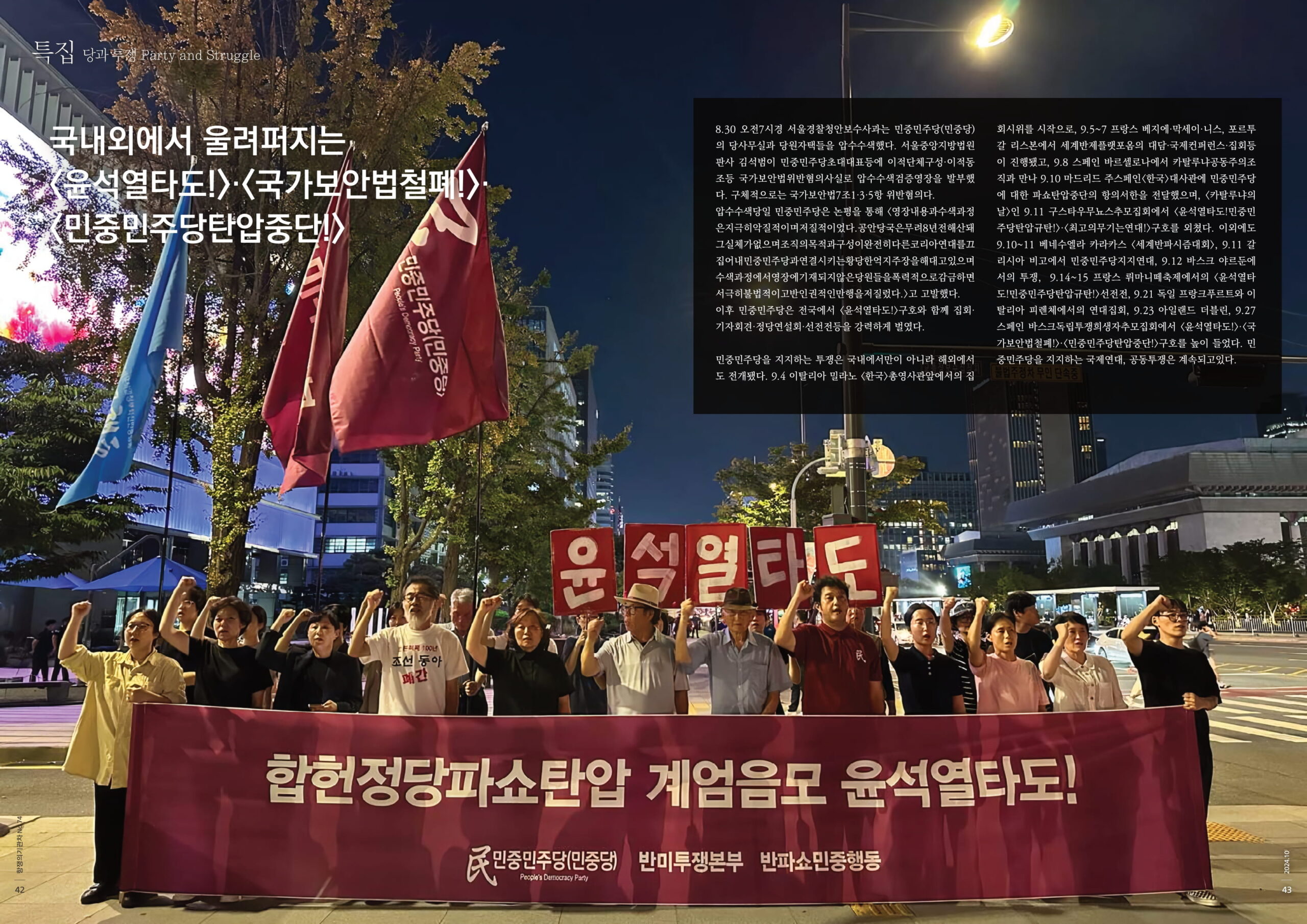 민중민주당을 지지하는 투쟁은 국내에서만이 아니라 해외에서도 전개됐다. 9.4 이탈리아 밀라노 <한국>총영사관앞에서의 집회시위를 시작으로, 9.5~7 프랑스 베지에·막세이·니스, 포르투갈 리스본에서 세계반제플랫포옴의 대담·국제컨퍼런스·집회등이 진행됐고, 9.8 스페인 바르셀로나에서 카탈루냐공동주의조직과 만나 9.10 마드리드 주스페인<한국>대사관에 민중민주당에 대한 파쇼탄압중단의 항의서한을 전달했으며, <카탈루냐의날>인 9.11 구스타우무뇨스추모집회에서 <윤석열타도!민중민주당탄압규탄!>·<최고의무기는연대!>구호를 외쳤다. 이외에도 9.10~11 베네수엘라 카라카스 <세계반파시즘대회>, 9.11 갈리시아 비고에서 민중민주당지지연대, 9.12 바스크 야르둔에서의 투쟁, 9.14~15 프랑스 뤼마니떼축제에서의 <윤석열타도!민중민주당탄압규탄!>선전전, 9.21 독일 프랑크푸르트와 이탈리아 피렌체에서의 연대집회, 9.23 아일랜드 더블린, 9.27 스페인 바스크독립투쟁희생자추모집회에서 <윤석열타도!>·<국가보안법철폐!>·<민중민주당탄압중단!>구호를 높이 들었다. 민중민주당을 지지하는 국제연대, 공동투쟁은 계속되고있다.