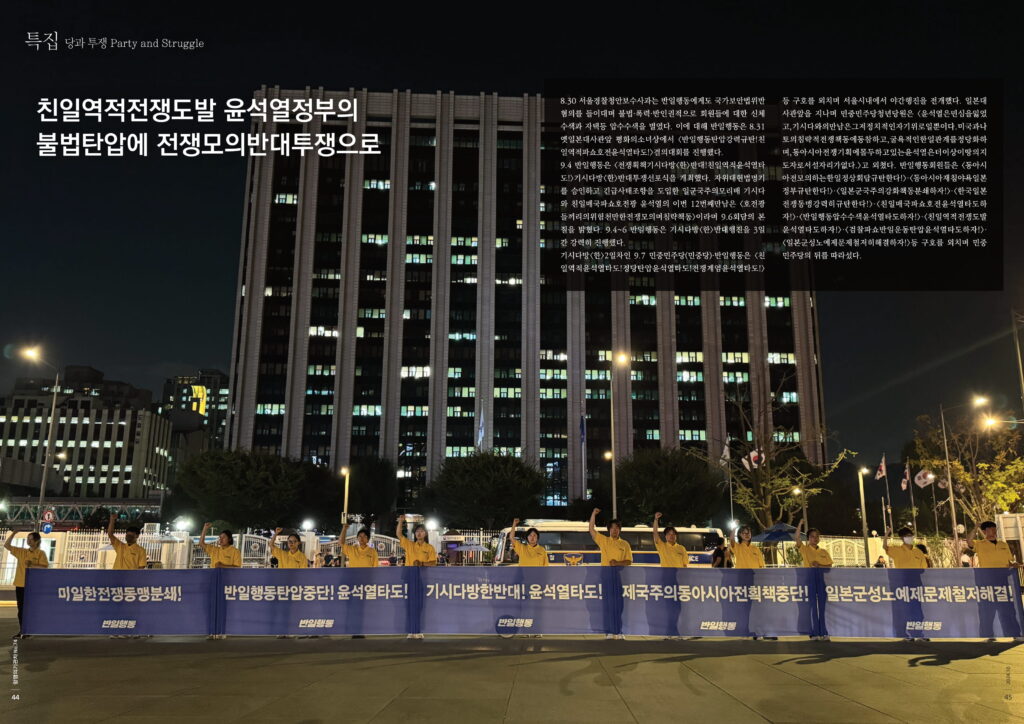 기시다방<한>2일차인 9.7 민중민주당(민중당)·반일행동은 <친일역적윤석열타도!정당탄압윤석열타도!전쟁계엄윤석열타도!>등 구호를 외치며 서울시내에서 야간행진을 전개했다. 일본대사관앞을 지나며 민중민주당청년당원은 <윤석열은민심을잃었고,기시다와의만남은그저정치적인자기위로일뿐이다.미국과나토의침략적전쟁책동에동참하고,굴욕적인한일관계를정당화하며,동아시아전쟁기획에몰두하고있는윤석열은더이상이땅의지도자로서설자리가없다.>고 외쳤다. 반일행동회원들은 <동아시아전모의하는한일정상회담규탄한다!>·<동아시아재침야욕일본정부규탄한다!>·<일본군국주의강화책동분쇄하자!>·<한국일본전쟁동맹강력히규탄한다!>·<친일매국파쇼호전윤석열타도하자!>·<반일행동압수수색윤석열타도하자!>·<친일역적전쟁도발윤석열타도하자!>·<검찰파쇼반일운동탄압윤석열타도하자!>·<일본군성노예제문제철저히해결하자!>등 구호를 외치며 민중민주당의 뒤를 따라섰다.