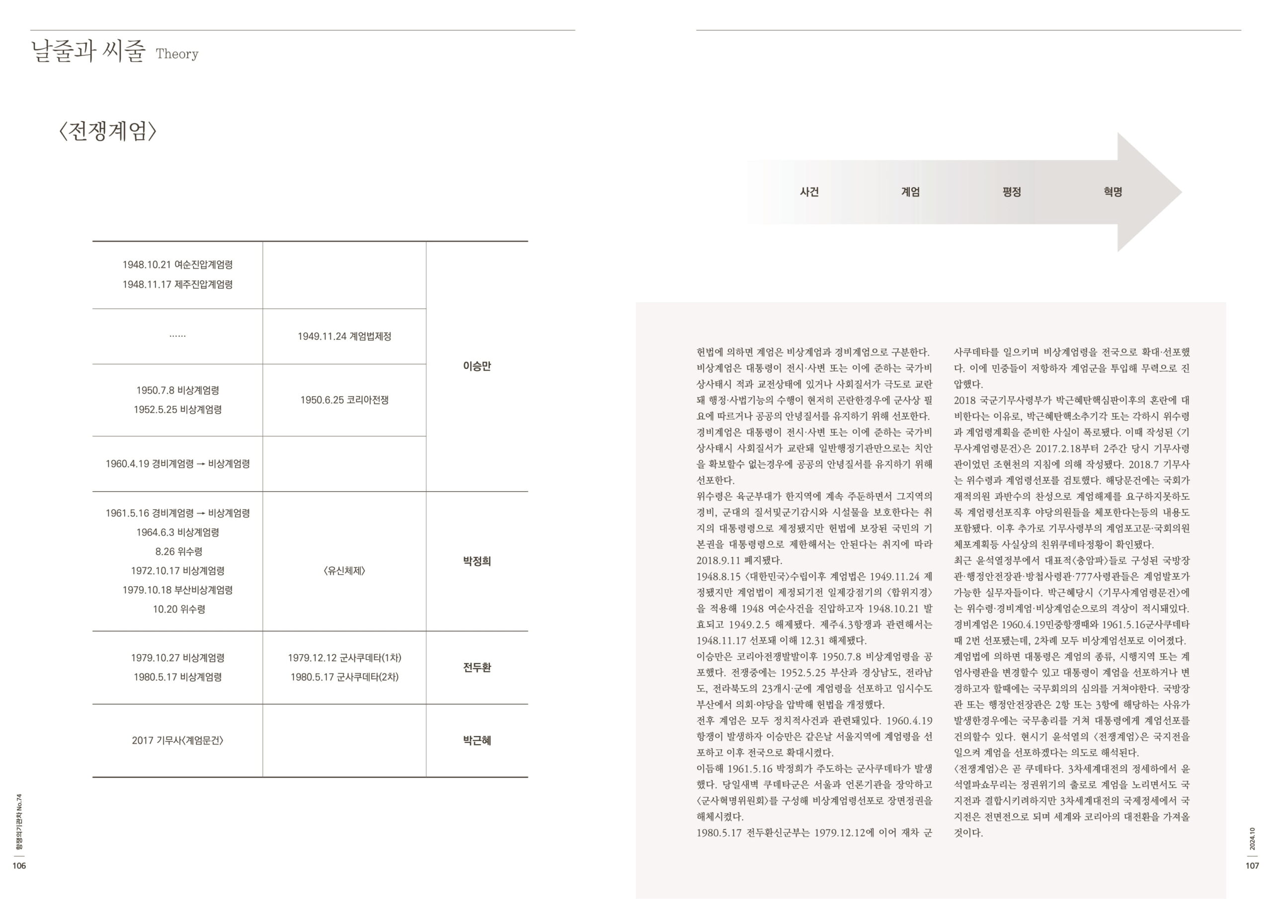 전후 계엄은 모두 정치적사건과 관련돼있다. 1960.4.19 항쟁이 발생하자 이승만은 같은날 서울지역에 계엄령을 선포하고 이후 전국으로 확대시켰다.