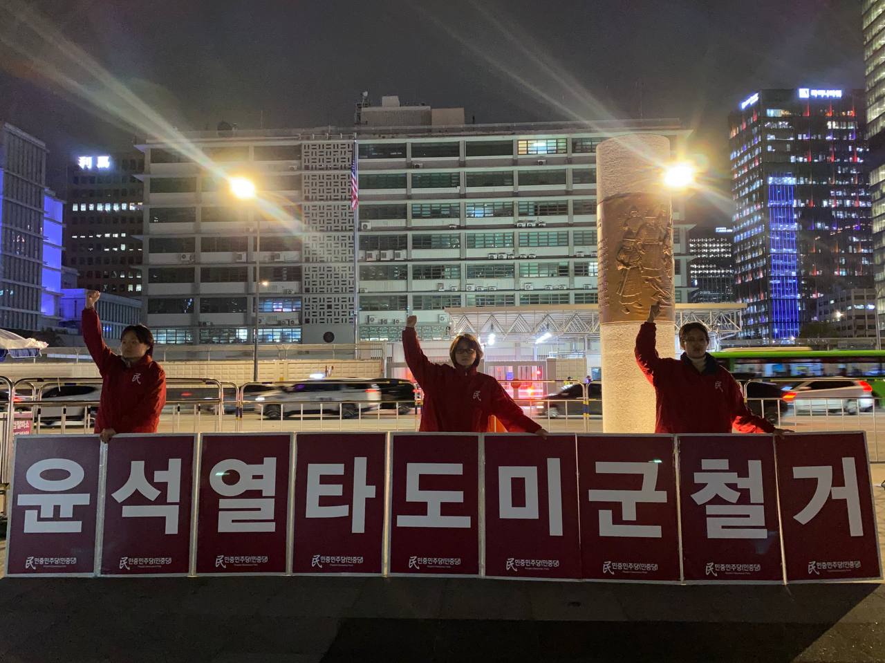 미대사관정문 맞은편에서는 우리말과 영어로 된 구호 <북침핵전쟁책동중단! 미군철거! 윤석열타도!>를 들고 <광화문미대사관앞철야시위>를 진행했다. <김병동석방! 윤석열타도!>, <검찰파쇼 정당탄압 전쟁계엄 윤석열타도!> 구호도 함께 들었다.