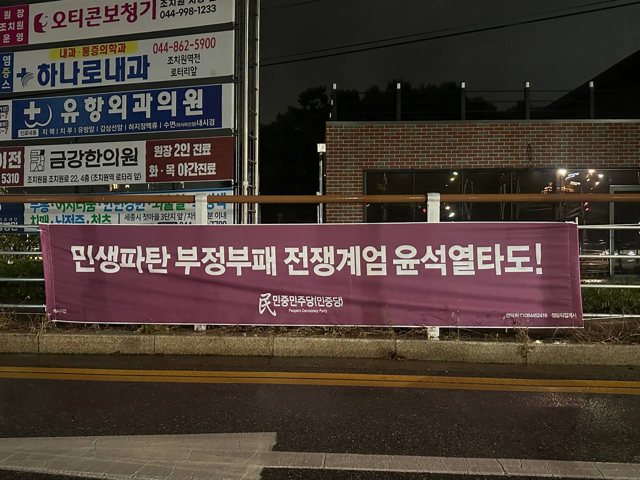 정당연설회 민중민주당 22일 조치원 〈윤석열타도!〉가로막게시 2024년 10월 23일 FacebookTwitter 22일 민중민주당(민중당)은 세종 조치원읍 서창리에 가로막 <부패무능 정당탄압 전쟁계엄 윤석열타도!>를 내걸었다.