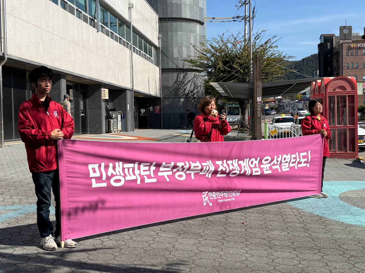 25일 민중민주당(민중당)은 강원도 홍천종합버스터미널앞에서 정당연설회를 진행하고 가로막 <부패무능 정당탄압 전쟁계엄 윤석열타도!>를 홍천일대에 내걸었다.