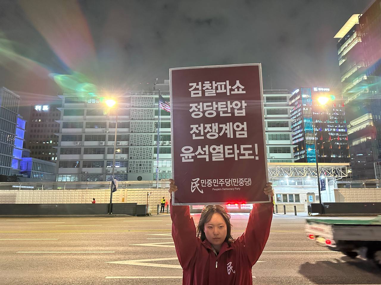미대사관정문 맞은편에서는 우리말과 영어로 된 구호 <북침핵전쟁책동중단! 미군철거! 윤석열타도!>를 들고 <광화문미대사관앞철야시위>를 진행했다. <김병동석방! 윤석열타도!>, <검찰파쇼 정당탄압 전쟁계엄 윤석열타도!> 구호도 함께 들었다.