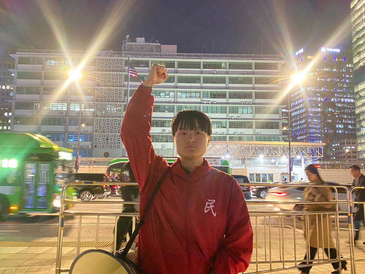 미대사관정문 맞은편에서는 우리말과 영어로 된 구호 <북침핵전쟁책동중단! 미군철거! 윤석열타도!>를 들고 <광화문미대사관앞철야시위>를 진행했다. <김병동석방! 윤석열타도!>, <검찰파쇼 정당탄압 전쟁계엄 윤석열타도!> 구호도 함께 들었다.