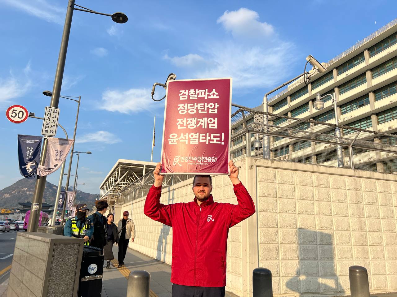 미대사관정문 맞은편에서는 우리말과 영어로 된 구호 <북침핵전쟁책동중단! 미군철거! 윤석열타도!>를 들고 <광화문미대사관앞철야시위>를 진행했다. <김병동석방! 윤석열타도!>, <검찰파쇼 정당탄압 전쟁계엄 윤석열타도!> 구호도 함께 들었다.