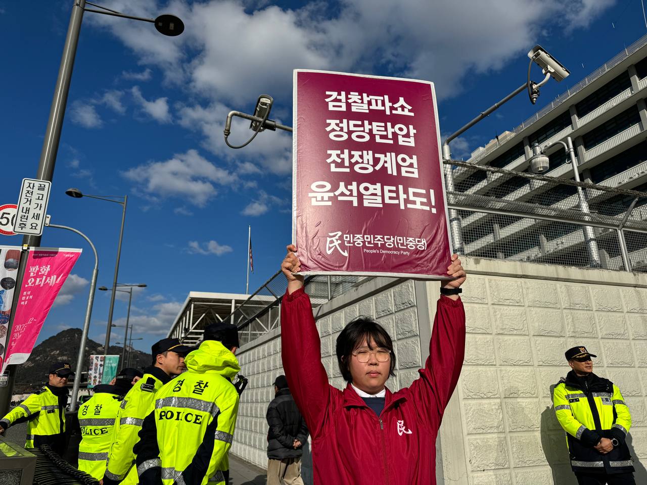 23일 민중민주당(민중당)은 미대사관앞에서 <친미호전윤석열타도! 북침핵전쟁책동중단! 핵전쟁화근 미군철거!> 구호를 들고 평화시위를 3048일째 전개했다.