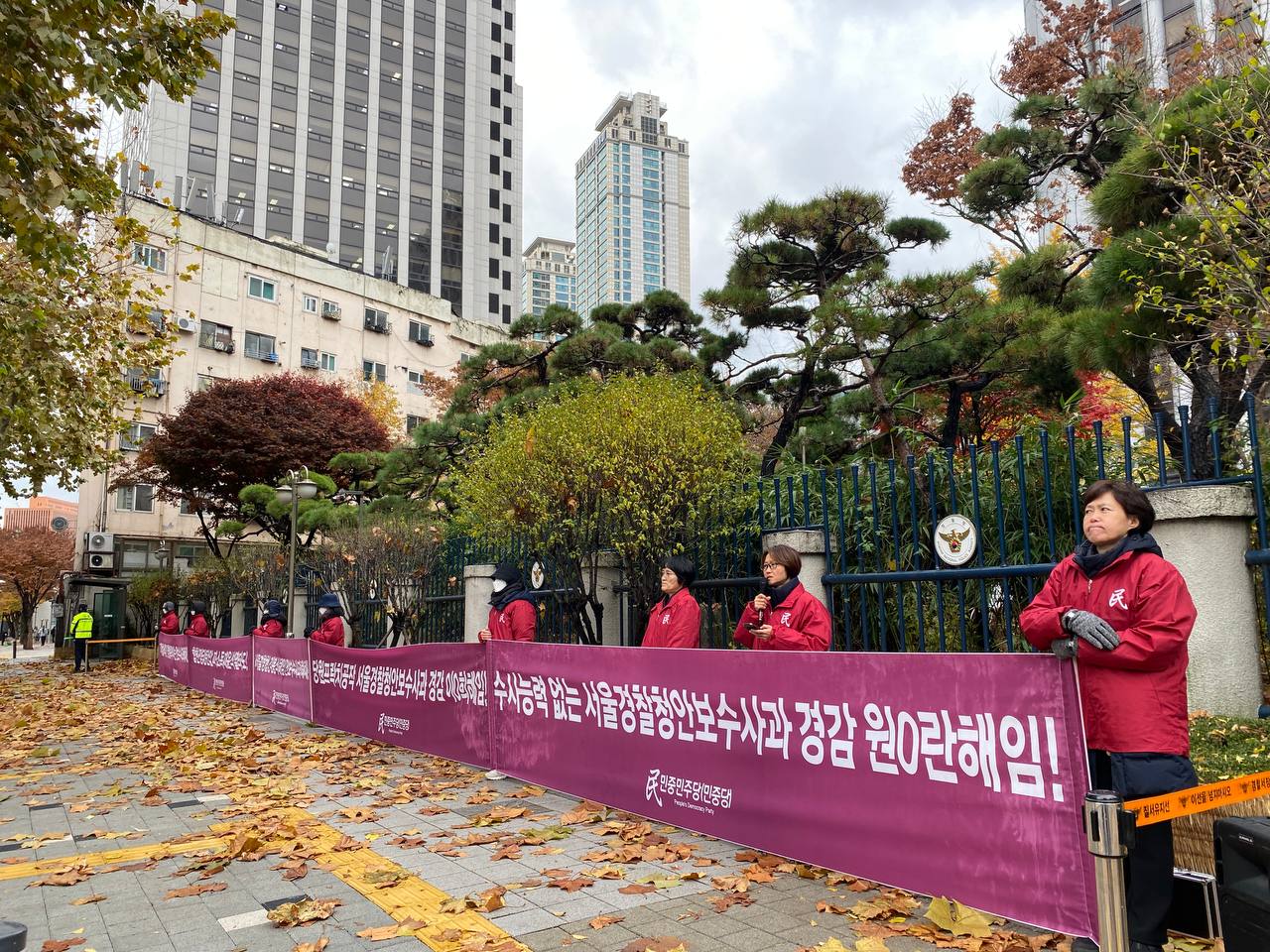 당원들은 <지랄하네?! 경찰욕먹이는 안보수사과해체!>, <합헌정당탄압 파쇼독재윤석열타도!>, <서울경찰청 김봉식해임 안보수사과해체!>, <당원프락치공작 서울경찰청안보수사과 경감 이0희해임!>, <수사능력 없는 서울경찰청안보수사과 경감 원0란해임!> 구호의 가로막을 일렬로 쭉 펼치고 시위했다.