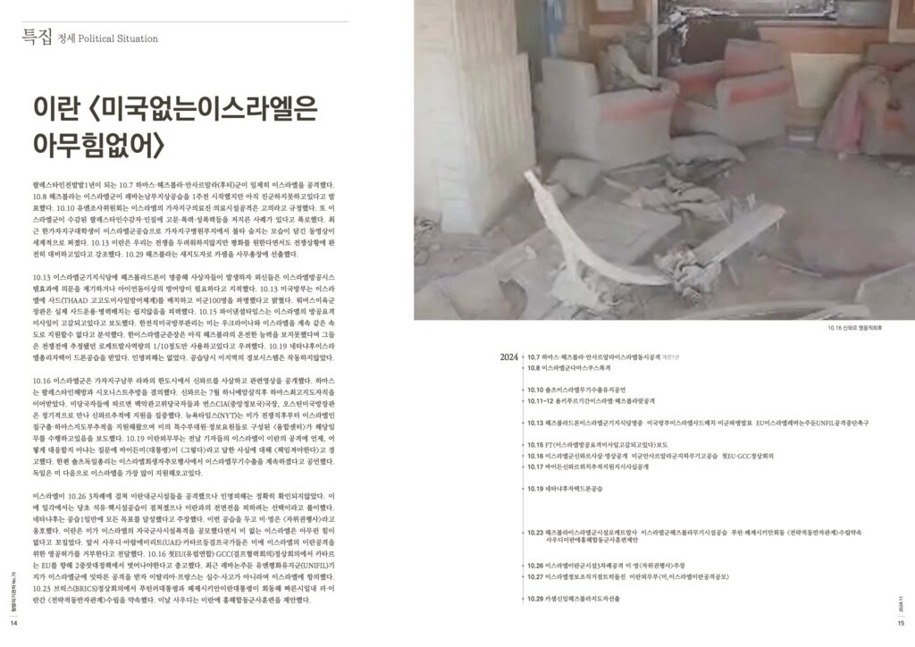 팔레스타인전발발1년이 되는 10.7 하마스·헤즈볼라·안사르알라(후티)군이 일제히 이스라엘을 공격했다. 10.8 헤즈볼라는 이스라엘군이 레바논남부지상공습을 1주전 시작했지만 아직 진군하지못하고있다고 발표했다. 10.10 유엔조사위원회는 이스라엘의 가자지구의료진·의료시설공격은 고의라고 규정했다. 또 이스라엘군이 수감된 팔레스타인수감자·인질에 고문·폭력·성폭력등을 저지른 사례가 있다고 폭로했다. 최근 한가자지구대학생이 이스라엘군공습으로 가자지구병원부지에서 불타 숨지는 모습이 담긴 동영상이 세계적으로 퍼졌다. 10.13 이란은 우리는 전쟁을 두려워하지않지만 평화를 원한다면서도 전쟁상황에 완전히 대비하고있다고 강조했다. 10.29 헤즈볼라는 새지도자로 카셈을 사무총장에 선출했다.