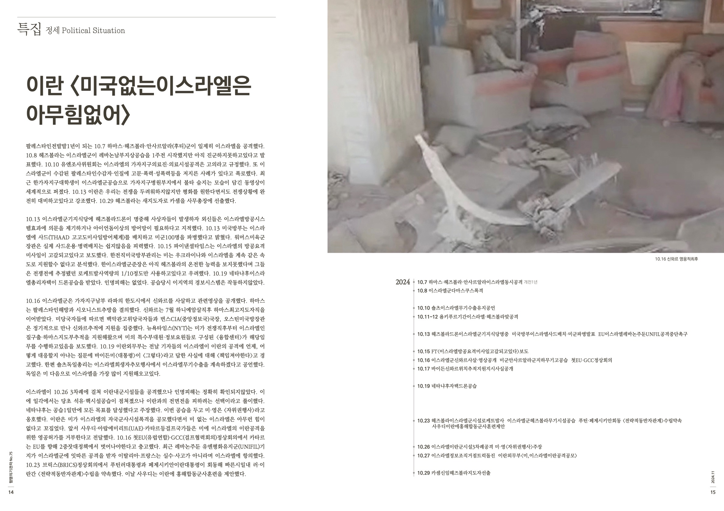 이스라엘이 10.26 3차례에 걸쳐 이란내군시설들을 공격했으나 인명피해는 정확히 확인되지않았다. 이에 일각에서는 당초 석유·핵시설공습이 점쳐졌으나 이란과의 전면전을 피하려는 선택이라고 풀이했다. 네타냐후는 공습1일만에 모든 목표를 달성했다고 주장했다. 이번 공습을 두고 미·영은 <자위권행사>라고 옹호했다. 이란은 미가 이스라엘의 자국군사시설폭격을 공모했다면서 미 없는 이스라엘은 아무런 힘이 없다고 꼬집었다. 앞서 사우디·아랍에미리트(UAE)·카타르등걸프국가들은 미에 이스라엘의 이란공격을 위한 영공허가를 거부한다고 전달했다. 10.16 첫EU(유럽연합)·GCC(걸프협력회의)정상회의에서 카타르는 EU를 향해 2중잣대정책에서 벗어나야한다고 충고했다. 최근 레바논주둔 유엔평화유지군(UNIFIL)기지가 이스라엘군에 잇따른 공격을 받자 이탈리아·프랑스는 실수·사고가 아니라며 이스라엘에 항의했다. 10.23 브릭스(BRICS)정상회의에서 푸틴러대통령과 페제시키안이란대통령이 회동해 빠른시일내 러·이란간 <전략적동반자관계>수립을 약속했다. 이날 사우디는 이란에 홍해합동군사훈련을 제안했다.