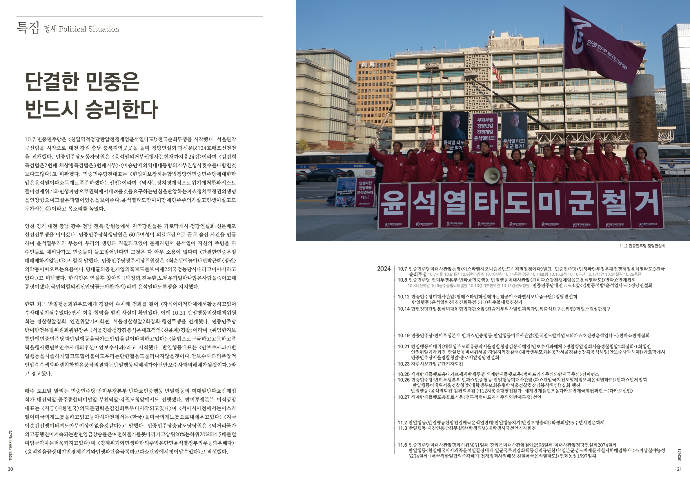 10.7 민중민주당은 <친일역적정당탄압전쟁계엄윤석열타도!>전국순회투쟁을 시작했다. 서울관악구신림을 시작으로 대전·강원·충남·충북지역곳곳을 돌며 정당연설회·당신문民124호배포선전전을 전개했다. 민중민주당노동자당원은 <윤석열의거부권행사는현재까지총24건>이라며 <김건희특검법은2번째,채상병특검법은3번째거부>·<이승만제외역대대통령의거부권행사횟수를다합친것보다도많다>고 비판했다. 민중민주당전대표는 <헌법이보장하는합법정당인민중민주당에대한탄압은윤석열이파쇼독재로폭주하겠다는선언>이라며 <역사는정치경제적으로위기에처한파시스트들이경제위기와민생파탄으로권력에서내려올것을요구하는민심을탄압하는파쇼정치로정권의생명을연장했으며그끝은파멸이었음을보여준다.윤석열타도만이이땅에민주주의가살고민생이살고모두가사는길>이라고 목소리를 높였다.