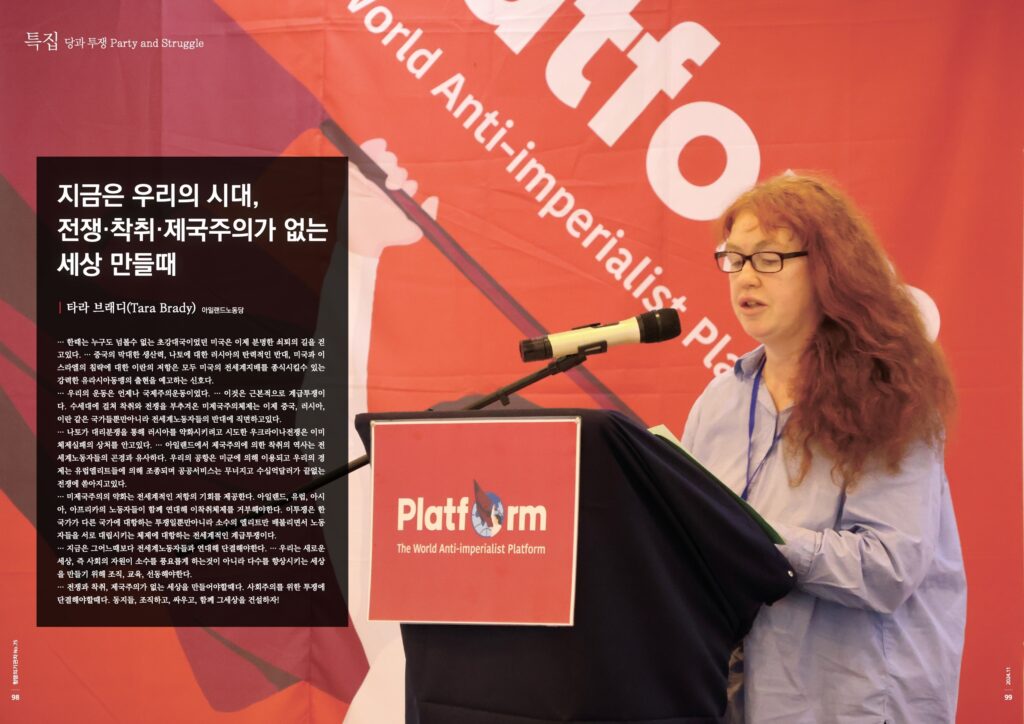 … 나토가 대리분쟁을 통해 러시아를 약화시키려고 시도한 우크라이나전쟁은 이미 체제실패의 상처를 안고있다. … 아일랜드에서 제국주의에 의한 착취의 역사는 전세계노동자들의 곤경과 유사하다. 우리의 공항은 미군에 의해 이용되고 우리의 경제는 유럽엘리트들에 의해 조종되며 공공서비스는 무너지고 수십억달러가 끝없는 전쟁에 쏟아지고있다.